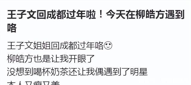 2月20日大年初四,有网友分享出在王子文老家成都偶遇到她的动态,从网友的附文来看是在一家咖啡店偶遇到王子文,心情激动的网友还大赞王子文本人又瘦又美。
